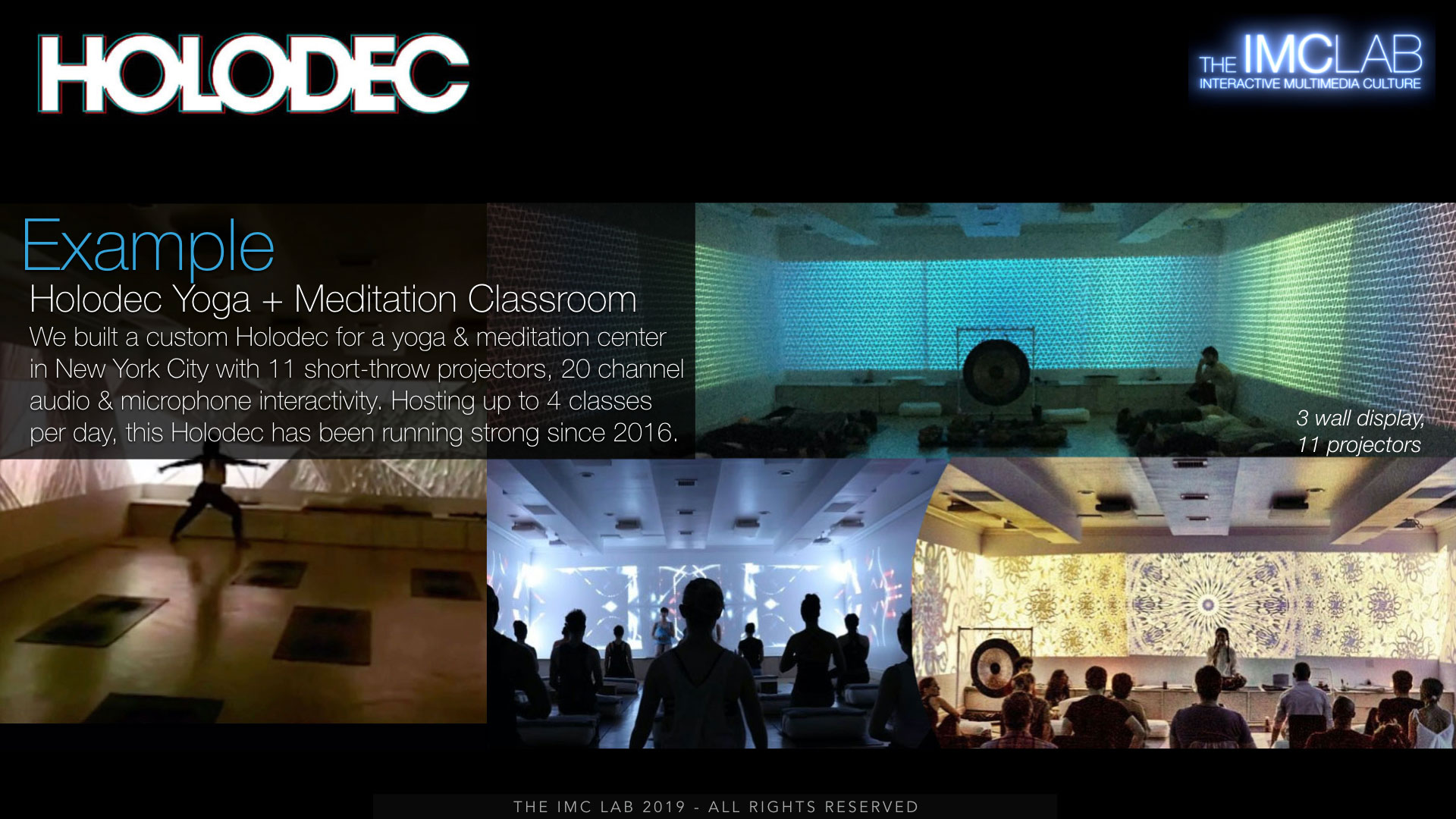 Enter the spaceship of the imagination & classroom of the future. Holodec is an immersion platform & mixed reality (XR) environment for schools, museums, hospitals, offices, gyms, yoga studios & entertainment. Maximize engagement & learning via interactive multi-sensory experiences. Use your content or our vast XR content library. Contact us for a brochure, prices, or to be a distributor. Holodec is the most advanced immersion platform on the market. Over 17+ years we've made XR experiences, content & software for Universities, United Nations, movie theaters, stadiums, Times Square, Google & Instagram featuring stereoscopic displays, 3D glasses & VR/AR headsets; A.I., face/body/hand tracking & speech recognition; multichannel audio & scent; IoT, sensors, haptics & more. |